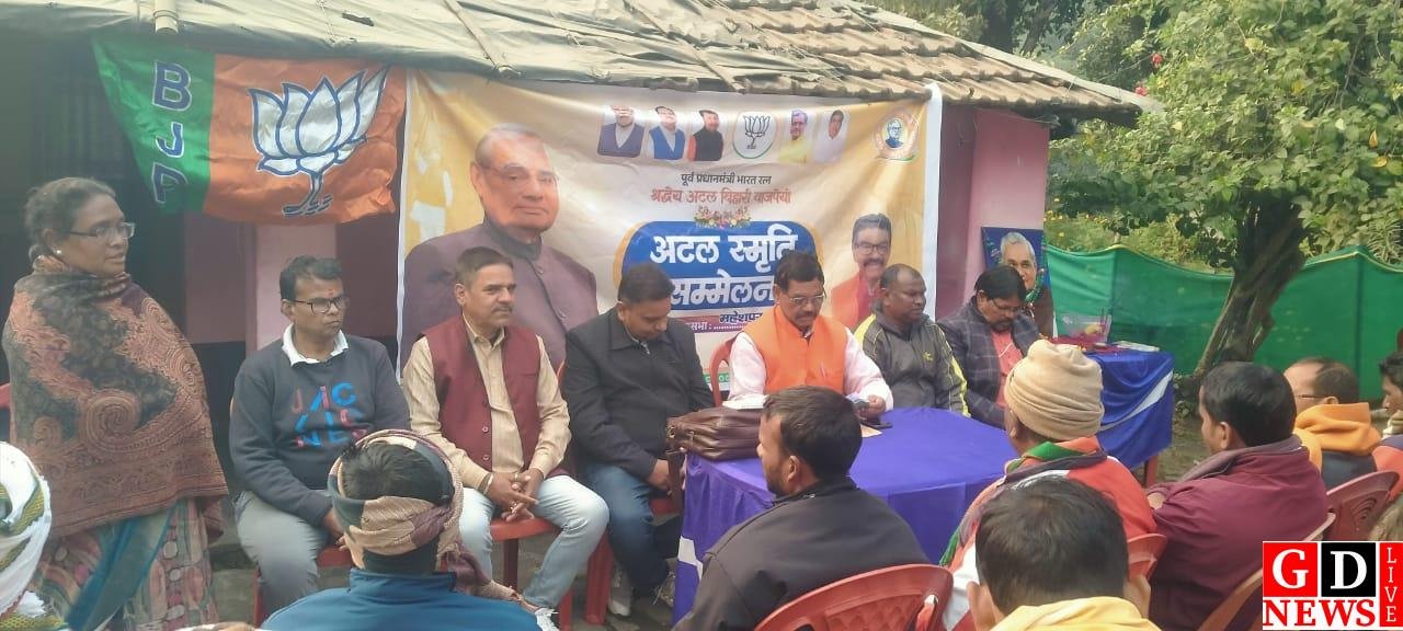 महेशपुर प्रखंड मुख्यालय स्थित काठशल्ला परिसर में रविवार को भारतीय जनता पार्टी महेशपुर मुख्यालय में स्व. अटल बिहारी वाजपेयी के जयंती पखवाड़े में विधानसभा स्तरीय समारोह आयोजित कर उनके जीवनकाल की परिचर्चा विस्तार से की गई. साथ ही भाजपा संगठन की मजबूती को लेकर चर्चा करते हुए कई निर्देश दिए गए. मौके पर कार्यक्रम प्रभारी दुर्गा मरांडी, जिला अध्यक्ष अमित पांडे, जिला उपाध्यक्ष धर्मेंद्र त्रिवेदी, पूर्व जिला अध्यक्ष सह भाजपा प्रत्याशी देवीधन टुडू, जिला महामंत्री सरीरा, रतन साह, मोजेस टुडू, विजय भंडारी, गौतम पाल, मदन पहाड़ियां, गोपाल भगत, लालू दे, सुबोध रविदास, चिम्पू सिंह, डब्लू सिंह , राहुल यादव, जोहन मरांडी, देवराज तिवारी, जिला के पूर्व महासचिव सुरेंद्र प्रसाद भगत, श्रवन कुमार सहित दर्जनों कार्यकर्ता मौजूद थे।