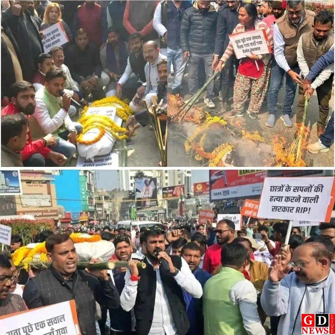 मेदनीनगर: SC–ST–OBC वर्ग के छात्रों को छात्रवृत्ति नहीं मिलने के विरोध में आज भाजपा युवा मोर्चा ने हेमंत सरकार के खिलाफ जोरदार प्रदर्शन किया। इस दौरान जिला स्कूल परिसर से अल्बर्ट एक्का चौक तक प्रतीकात्मक “शव यात्रा” निकाली गई, जिसके माध्यम से राज्य सरकार की छात्रविरोधी नीतियों पर सवाल खड़े किए गए।