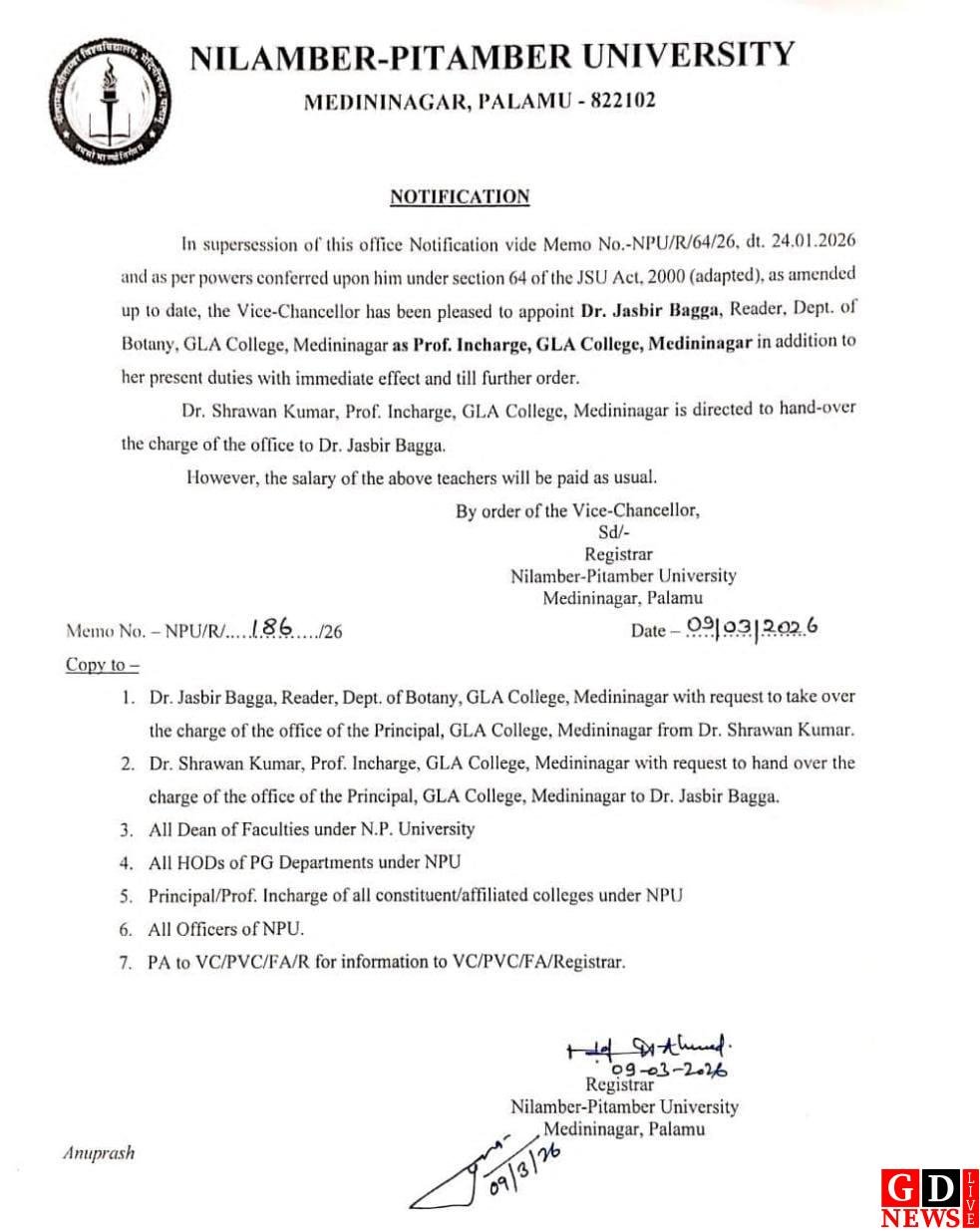 जिला संवाददाता अंकित कुमार लाल मेदिनीनगर। नीलांबर-पीतांबर विश्वविद्यालय के कुलपति के निर्देश पर मेदिनीनगर स्थित जीएलए कॉलेज डाल्टनगंज में प्रशासनिक स्तर पर महत्वपूर्ण बदलाव किया