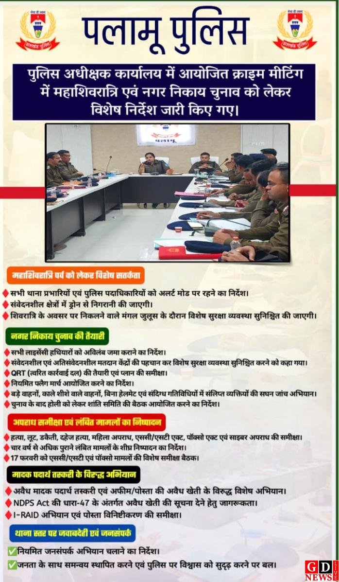 पलामू पुलिस की क्राइम मीटिंग में महाशिवरात्रि और निकाय चुनाव को लेकर सख्त निर्देश जारी
