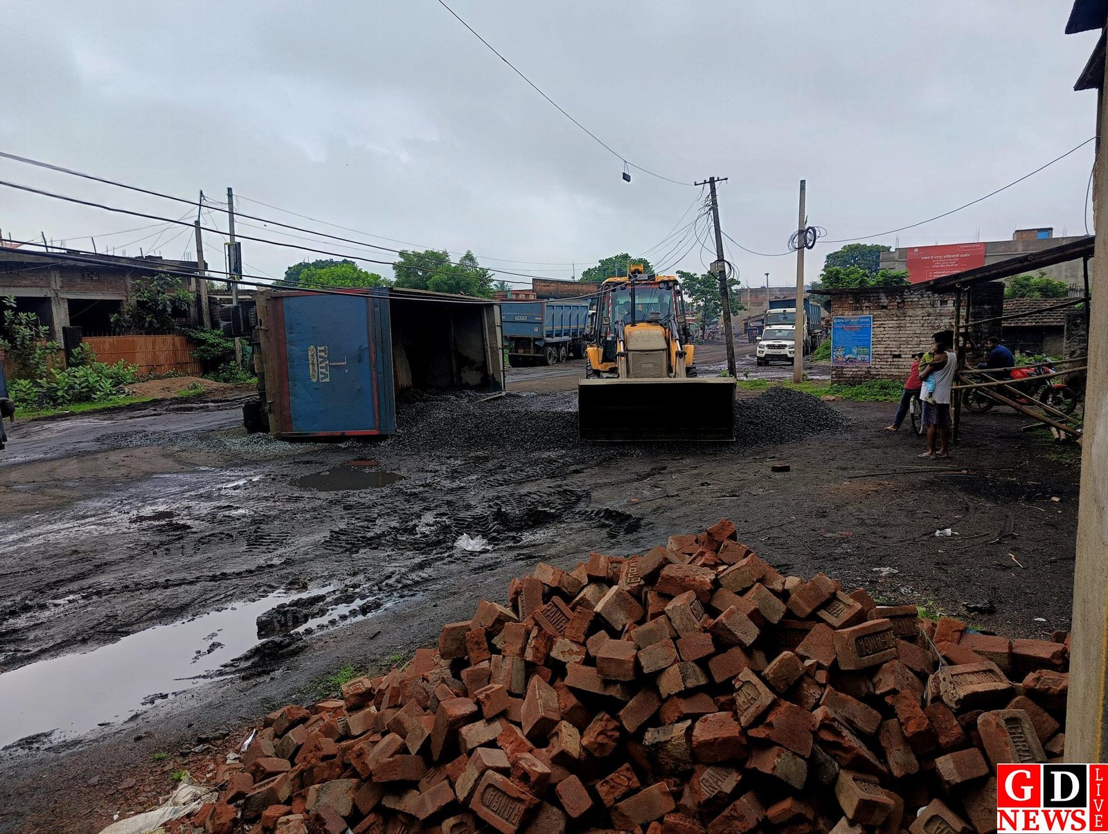 कोयला मोड़ के पास गिट्टी लदा हाईवा पलटा, बाल-बाल बचे चालक-खलासी, आवागमन रहा प्रभावित।