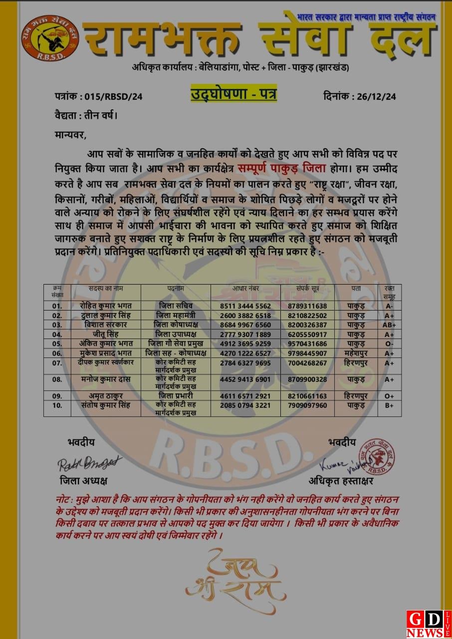 बजरंग पंडित पाकुड़ : भारत सरकार से मान्यता प्राप्त राष्ट्रीय हिन्दू संगठन रामभक्त सेवा दल ने गुरुवार को पाकुड़ जिला कमिटी का उद्घोषण किया। संगठन