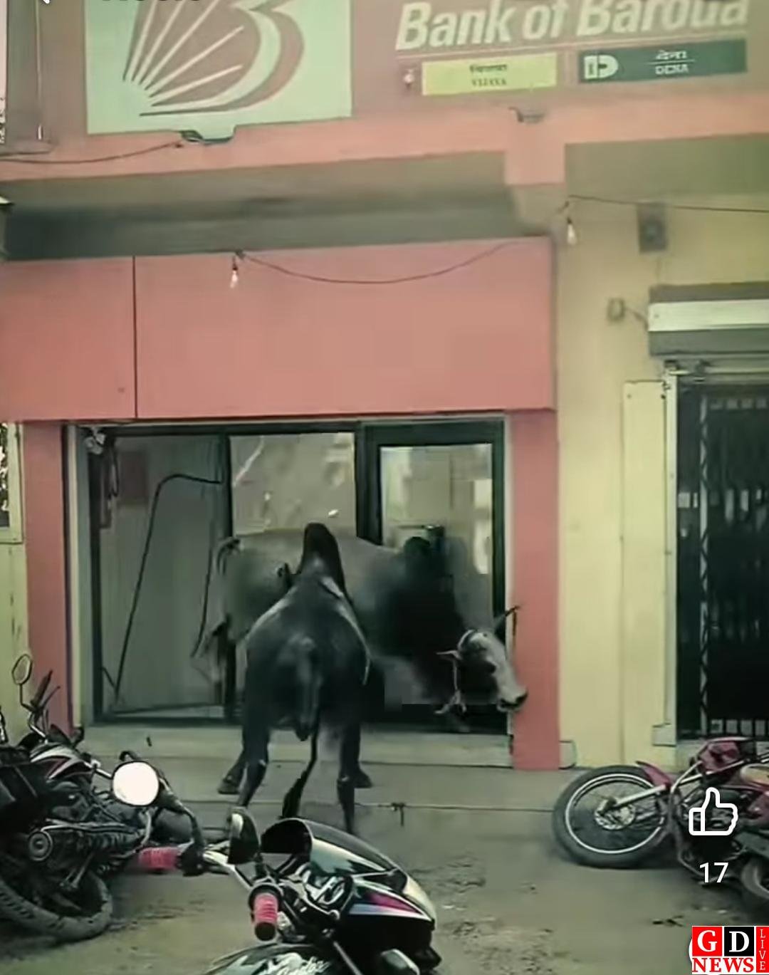 बैंक ऑफ़ बरोदा के समीप सांडों की भिड़ंत से अफरातफरी, बैंक एटीएम का टूटा शीशा।
