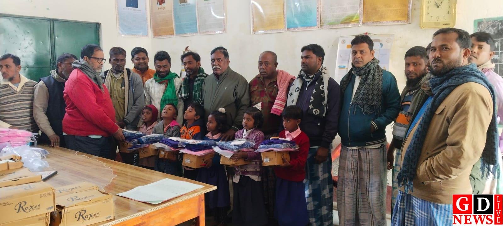 मुखिया के नेतृत्व में विद्यालय के बच्चों के बीच स्वेटर, ड्रेस, जूते-मोजे किए गए वितरित।