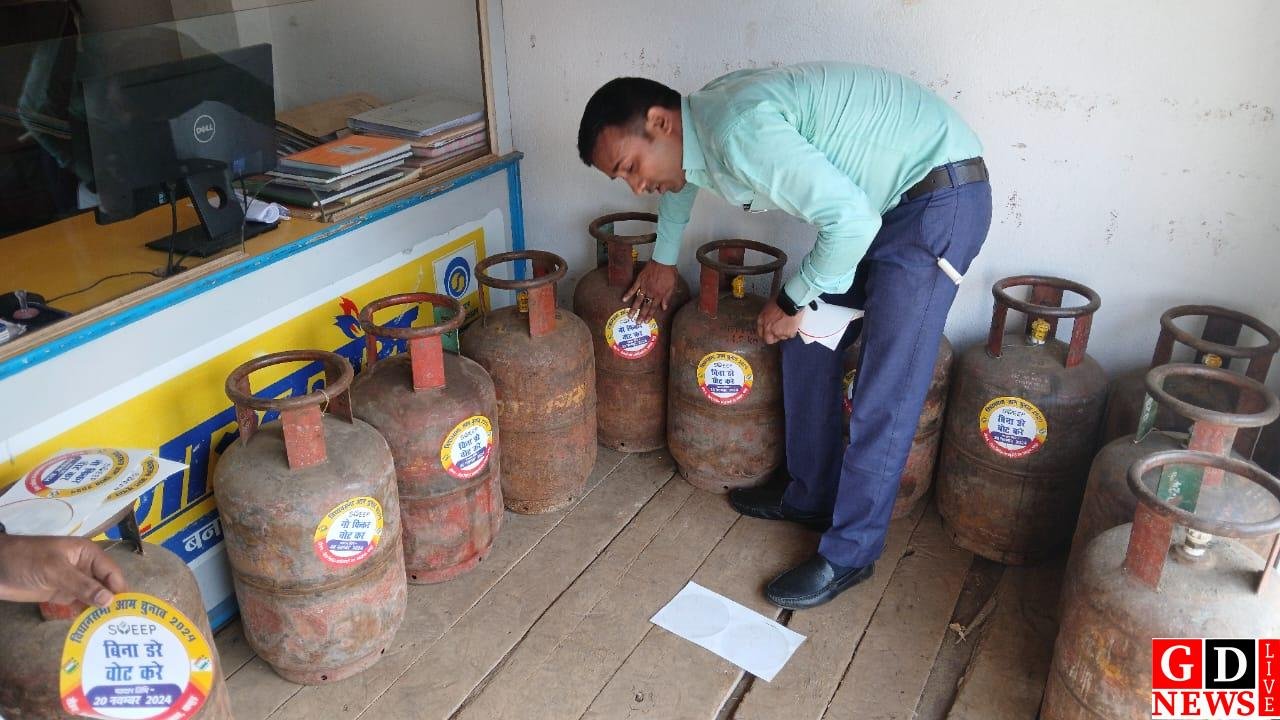 गैस सिलेंडर पर स्टीकर लगाकर मतदाताओं को मतदान के लिए किया जा रहा है प्रेरित।