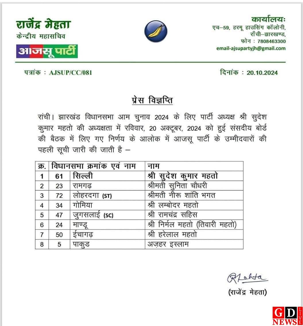 झारखंड विधानसभा चुनाव 2024: आजसू पार्टी ने जारी की पहली लिस्ट, 8 उम्मीदवारों के नाम का ऐलान