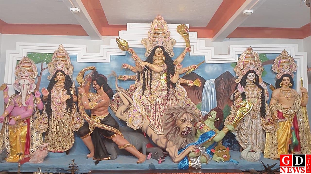 दुर्गा पूजा की तैयारियां पूरी, भव्य पंडाल और आकर्षक प्रतिमा से सजा मंदिर।