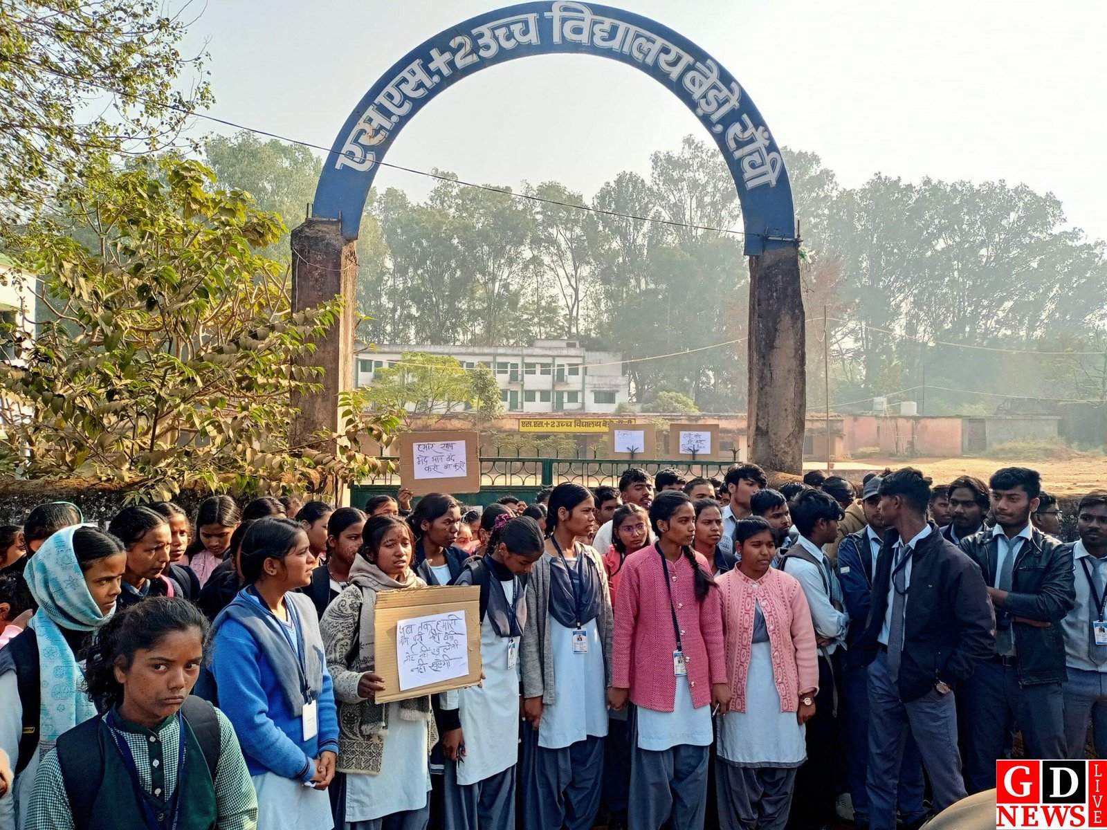 एस एस प्लस टू हाई स्कूल बेड़ो के 10वीं एवं 12वीं के छात्र, स्कूल परिसर के मुख्य द्वार पर ताला जड़कर, कर रहे हैं विरोध प्रदर्शन ।