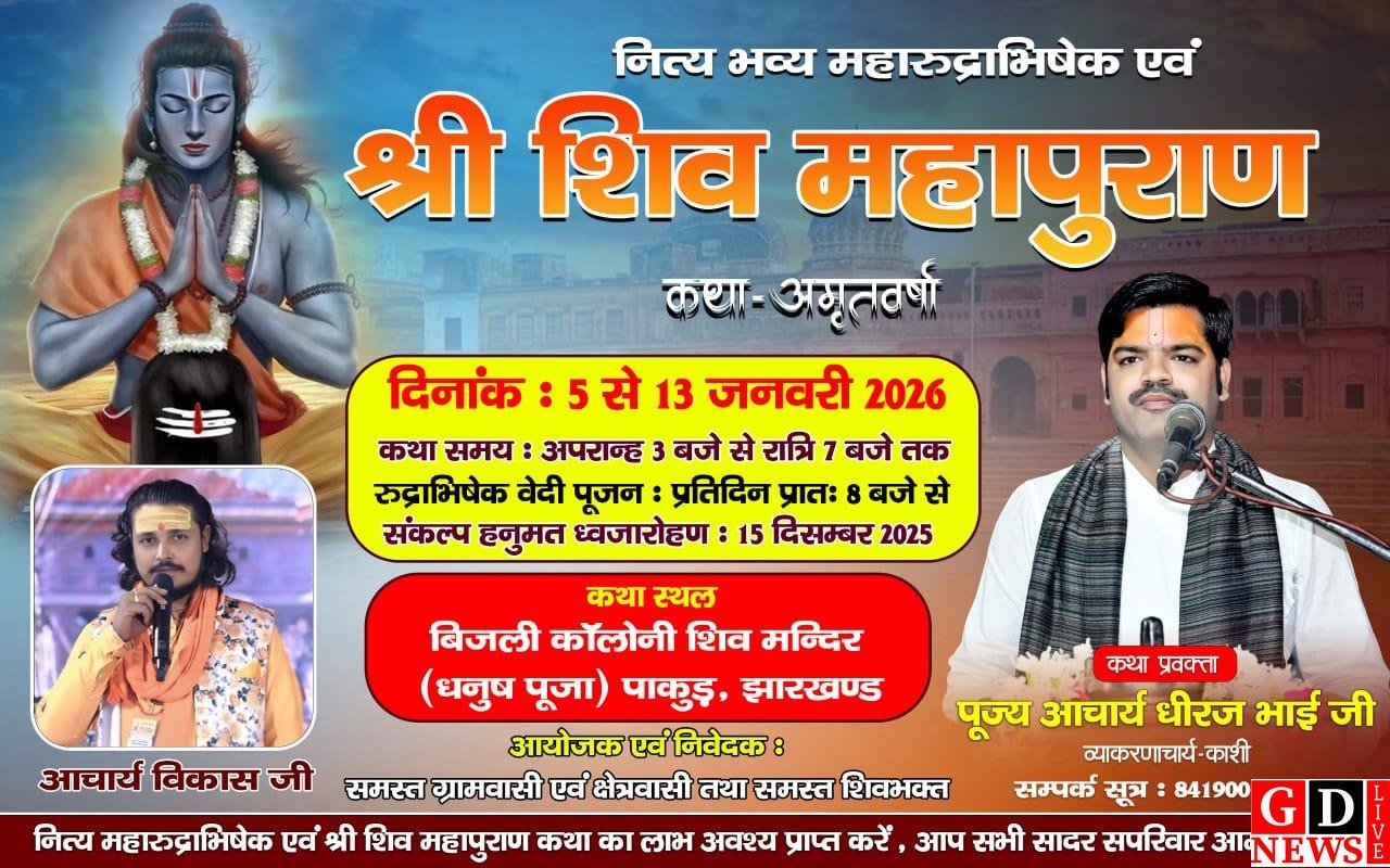 बजरंग पंडित पाकुड़। नव दिवसीय महाशिवपुराण कथा अमृतवर्षा के आयोजन को लेकर बिजली कॉलोनी स्थित शिव मंदिर प्रांगण में शुक्रवार को विधिवत संकल्प के साथ