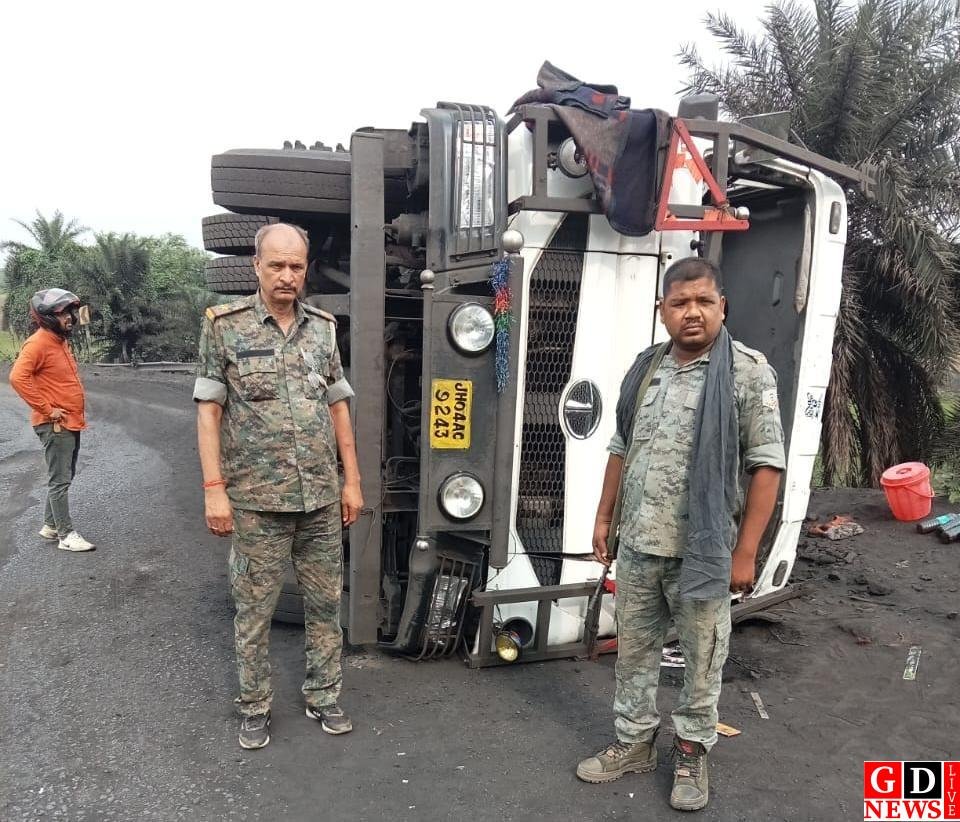 कोयला लदा हाइवा क्षतिग्रस्त।