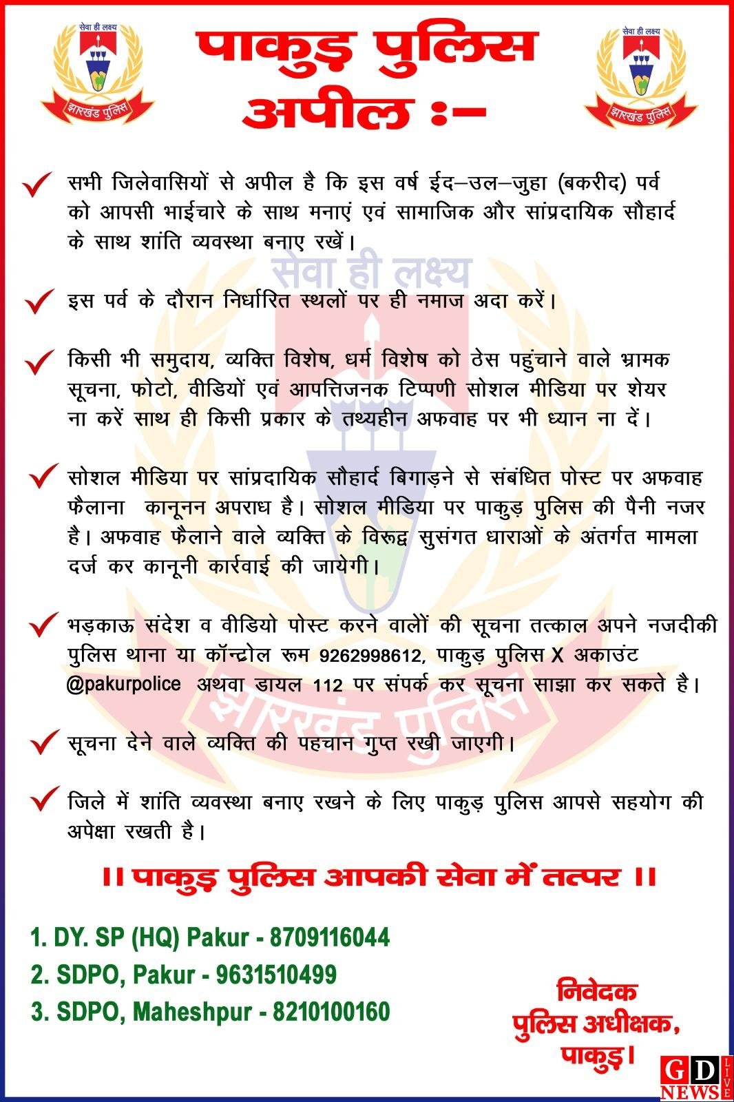 पाकुड़ पुलिस ने आम जनता से अपील की है कि आने वाले ईद-उल-जुहा पर्व को शांति, भाईचारा और सांप्रदायिक सौहार्दपूर्ण वातावरण में मनाएं। पुलिस ने