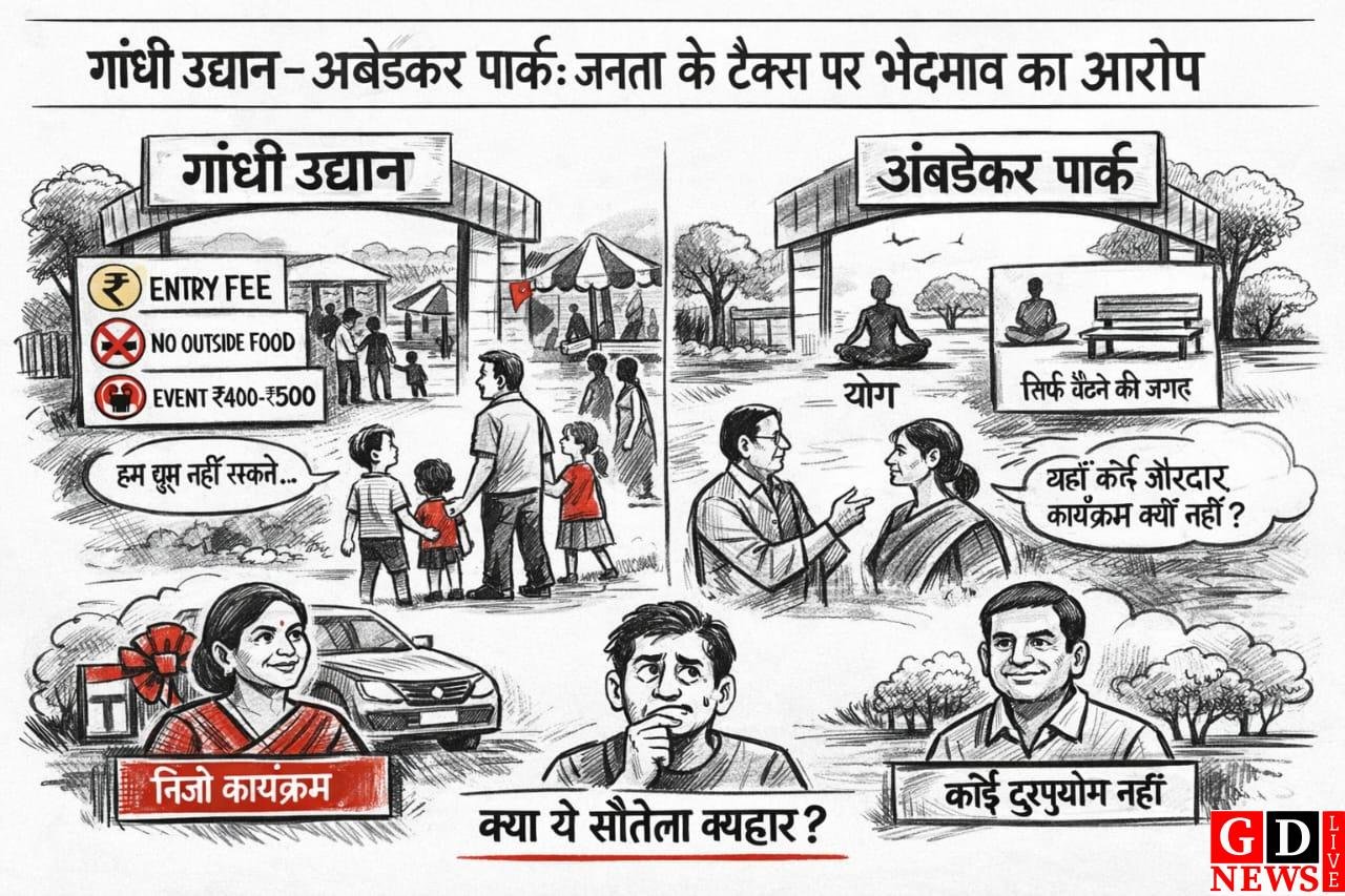 डालटेनगंज: नगर निगम क्षेत्र में जनता के टैक्स से बने दो प्रमुख सार्वजनिक स्थल—गांधी उद्यान और भीमराव अंबेडकर पार्क—इन दिनों असमान उपयोग और भेदभाव के आरोपों को लेकर चर्चा में हैं। स्थानीय लोगों का कहना है कि जहां गांधी उद्यान में एंट्री फीस, मनोरंजन शुल्क और निजी कार्यक्रमों की अनुमति दी जा रही है, वहीं अंबेडकर पार्क को लगातार नजरअंदाज किया जा रहा है।