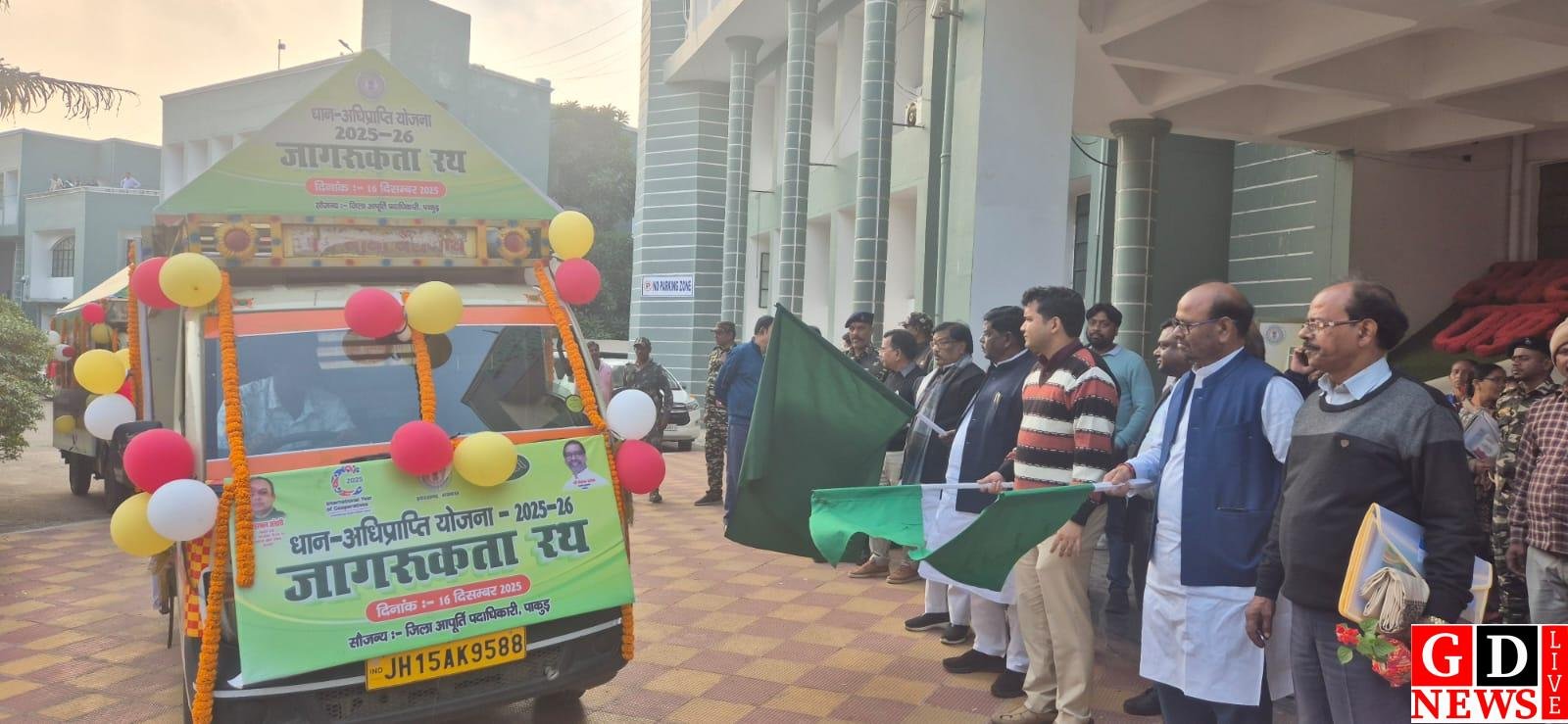 पाकुड़ जिला प्रशासन की ओर से किसानों को धान अधिप्राप्ति की सही जानकारी देने और उन्हें जागरूक करने के उद्देश्य से मंगलवार को समाहरणालय परिसर, पाकुड़ से विशेष जागरूकता रथ को हरी झंडी दिखाकर रवाना किया गया। रथ को विधायक महेशपुर, विधायक लिट्टीपाड़ा, उपायुक्त, उप विकास आयुक्त के साथ सांसद प्रतिनिधि एवं विधायक प्रतिनिधि ने संयुक्त रूप से रवाना किया। धान अधिप्राप्ति अभियान खरीफ विपणन मौसम 2025–26 के अंतर्गत आज से पूरे राज्य में प्रारंभ हो चुका है। किसानों को केंद्र सरकार द्वारा निर्धारित न्यूनतम समर्थन मूल्य ₹2369 प्रति क्विंटल के साथ राज्य सरकार की ओर से ₹81 प्रति क्विंटल बोनस दिया जा रहा है। इस प्रकार किसानों को कुल ₹2450 प्रति क्विंटल की दर से भुगतान किया जाएगा, जो एकमुश्त और समयबद्ध तरीके से किया जाएगा। पाकुड़ जिले में कुल 19 धान अधिप्राप्ति केंद्र स्थापित किए गए हैं, जहां निर्धारित प्रक्रिया के तहत पारदर्शी एवं सुचारु रूप से धान की खरीद की जाएगी। जागरूकता रथ के माध्यम से किसानों को धान अधिप्राप्ति की प्रक्रिया, पंजीकरण, अधिप्राप्ति केंद्रों की जानकारी और बोनस योजना से अवगत कराया जाएगा। इसके साथ ही यह रथ जिले के शहरी एवं ग्रामीण क्षेत्रों में भ्रमण कर सार्वजनिक वितरण प्रणाली (PDS), राशन कार्ड, खाद्य सुरक्षा योजना, उपभोक्ता अधिकार सहित अन्य सरकारी कल्याणकारी योजनाओं की जानकारी भी आम लोगों तक पहुंचाएगा। इस अवसर पर उपायुक्त मनीष कुमार ने कहा कि राज्य सरकार किसानों के हितों को सर्वोच्च प्राथमिकता दे रही है। धान अधिप्राप्ति से किसानों को उनकी उपज का उचित मूल्य मिलेगा और बिचौलियों से मुक्ति मिलेगी। उन्होंने संबंधित अधिकारियों को अभियान को सफल बनाने और किसानों की समस्याओं का त्वरित समाधान सुनिश्चित करने का निर्देश दिया।
