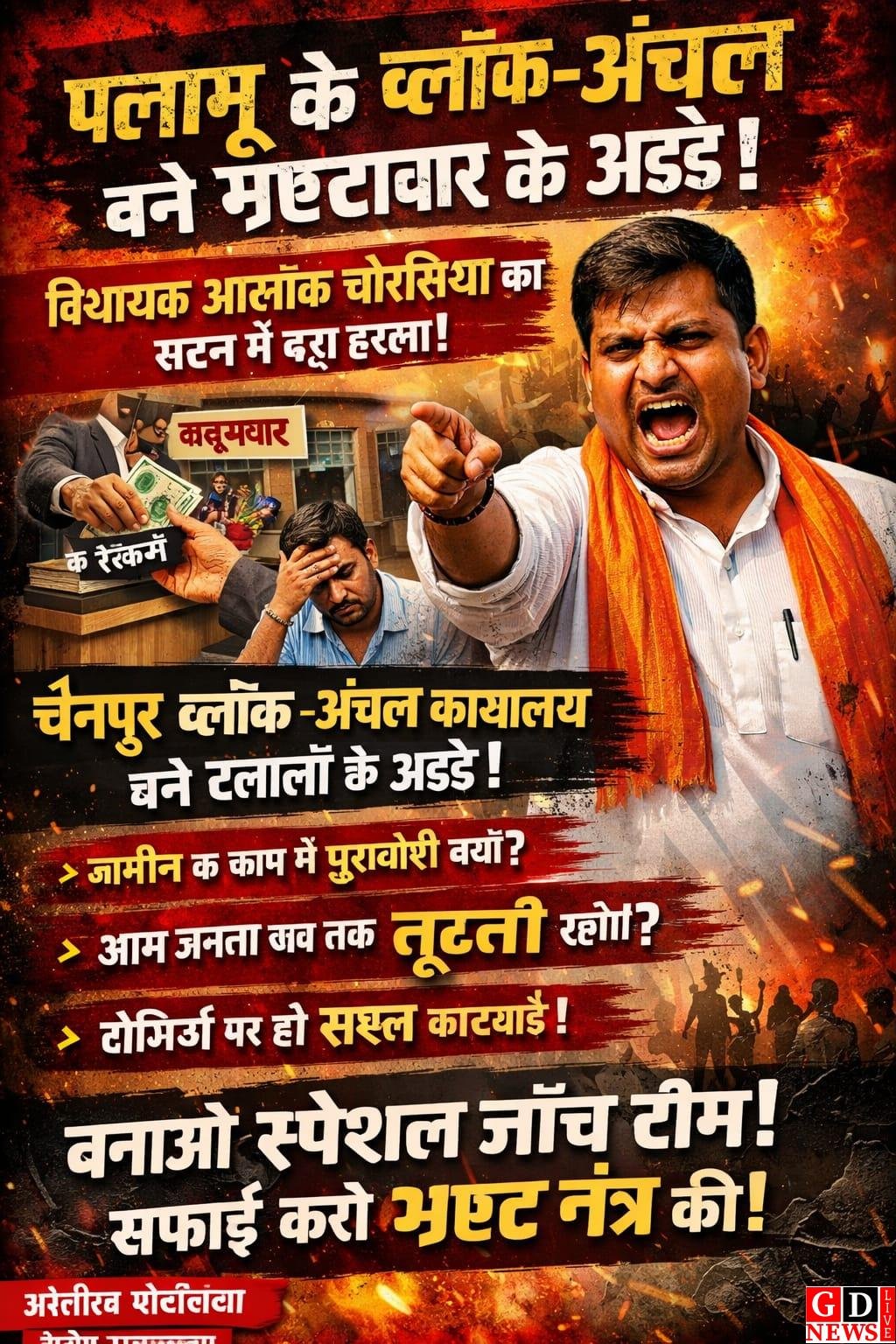 पलामू / मेदिनीनगर: डाल्टनगंज विधानसभा क्षेत्र के विधायक आलोक कुमार चौरसिया ने विधानसभा सत्र के दौरान पलामू में फैले भ्रष्टाचार को लेकर सरकार और प्रशासन पर जोरदार हमला बोला। सदन में बोलते हुए उन्होंने कहा कि उनके विधानसभा क्षेत्र के चैनपुर ब्लॉक, चैनपुर अंचल, सदर मेदिनीनगर, भंडरिया, रामगढ़ बड़गड़ और सतबरवा अंचल कार्यालयों में भ्रष्टाचार इस कदर बढ़ चुका है कि आम जनता का काम बिना घूस के होना लगभग नामुमकिन हो गया है।