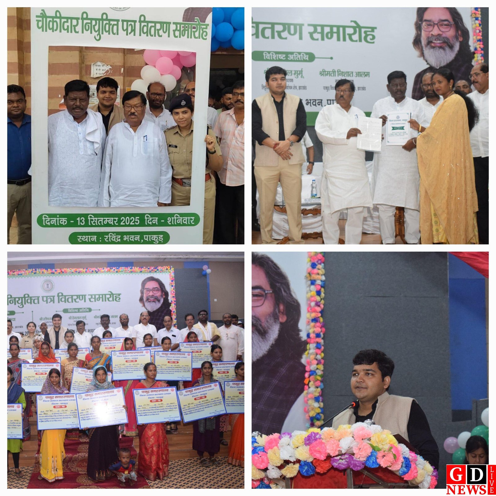 पाकुड़ | रविन्द्र भवन टाउन हॉल में शनिवार को जिला स्तरीय चौकीदार नियुक्ति पत्र वितरण समारोह का आयोजन हुआ। कार्यक्रम में लिट्टीपाड़ा विधायक हेमलाल मुर्मू और महेशपुर विधायक प्रो. स्टीफन मरांडी मुख्य अतिथि रहे। उपायुक्त मनीष कुमार, एसपी निधि द्विवेदी समेत जिला प्रशासन के कई वरीय पदाधिकारी मौजूद थे।
