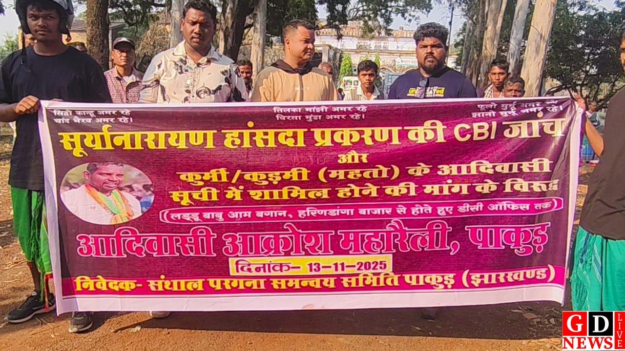 पाकुड़ : संताल परगना समन्वय समिति के बैनर तले गुरुवार को पाकुड़ टाउन की सड़कों पर हजारों आदिवासी युवाओं, सामाजिक कार्यकर्ताओं और छात्रों का जनसैलाब उमड़ पड़ा। परंपरागत वेशभूषा और हथियारों से सुसज्जित भीड़ ने सूर्या हांसदा को न्याय दो और ST सूची से छेड़छाड़ बंद करो जैसे नारों से पूरा शहर गूंजा दिया। यह बाइक रैली सह आदिवासी जनाक्रोश रैली सूर्या नारायण हांसदा प्रकरण की CBI जांच और कुर्मी/कुड़मि/महतो समुदाय के ST INCLUSION के विरोध में आयोजित की गई थी।रैली की शुरुआत लड्डू बाबू बागान से हुई और हरिनडांगा बाजार होते हुए उपायुक्त कार्यालय, पाकुड़ पहुंचकर एक सभा में तब्दील हो गई। सभा के बाद मुख्यमंत्री झारखंड के नाम CBI जांच की मांगपत्र और राष्ट्रपति के नाम ST INCLUSION के विरोध में ज्ञापन उपायुक्त के माध्यम से सौंपा गया।
